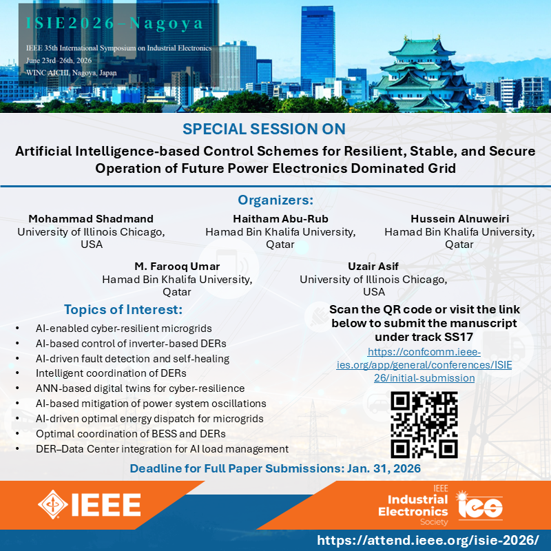 - Special Session on "Artificial Intelligence-based Control Schemes for Resilient, Stable, and Secure Operation of Future Power Electronics Dominated Grid" at ISIE, 2026.